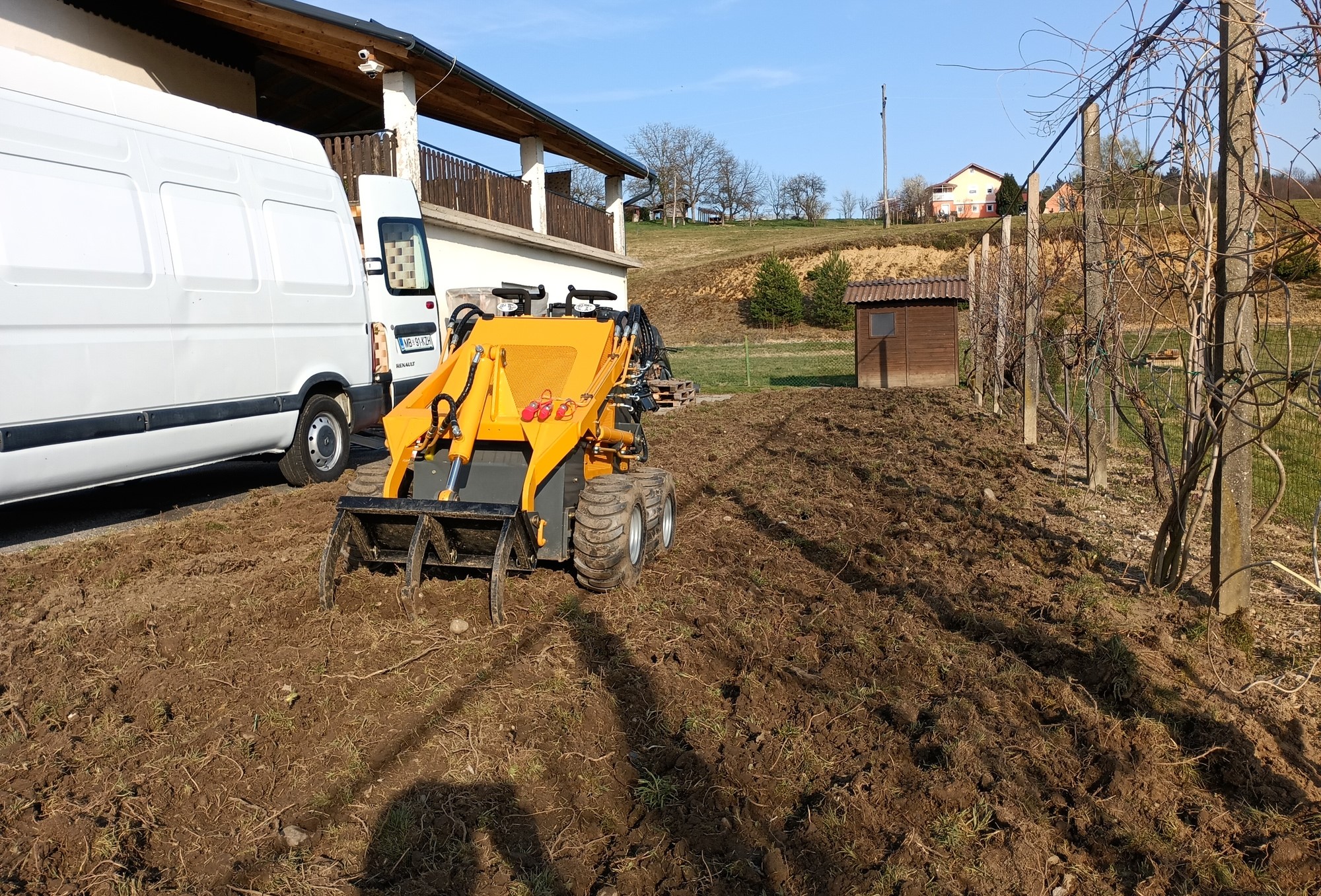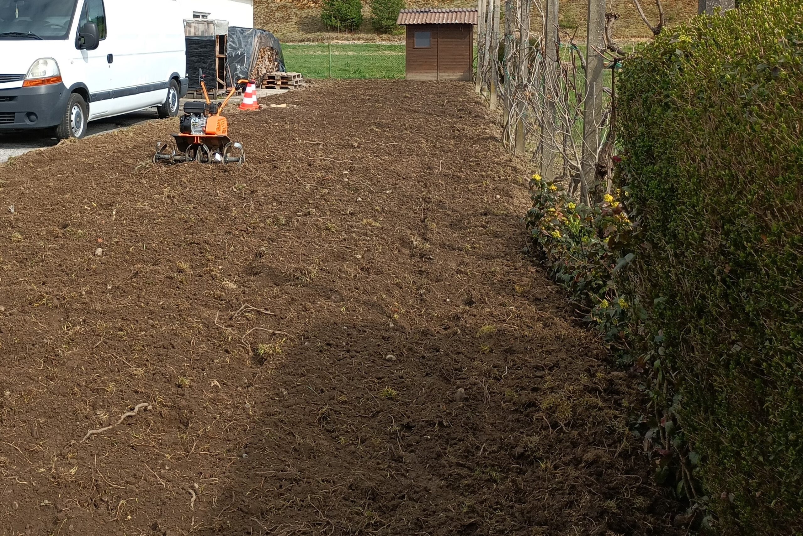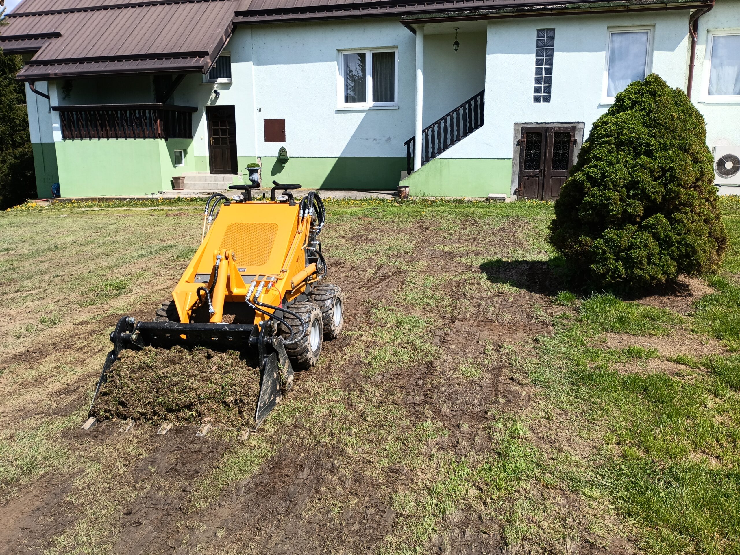 Razrahljamo zemljo z riperjem in jo z zemeljsko frezo pripravimo za setev zelenice.
