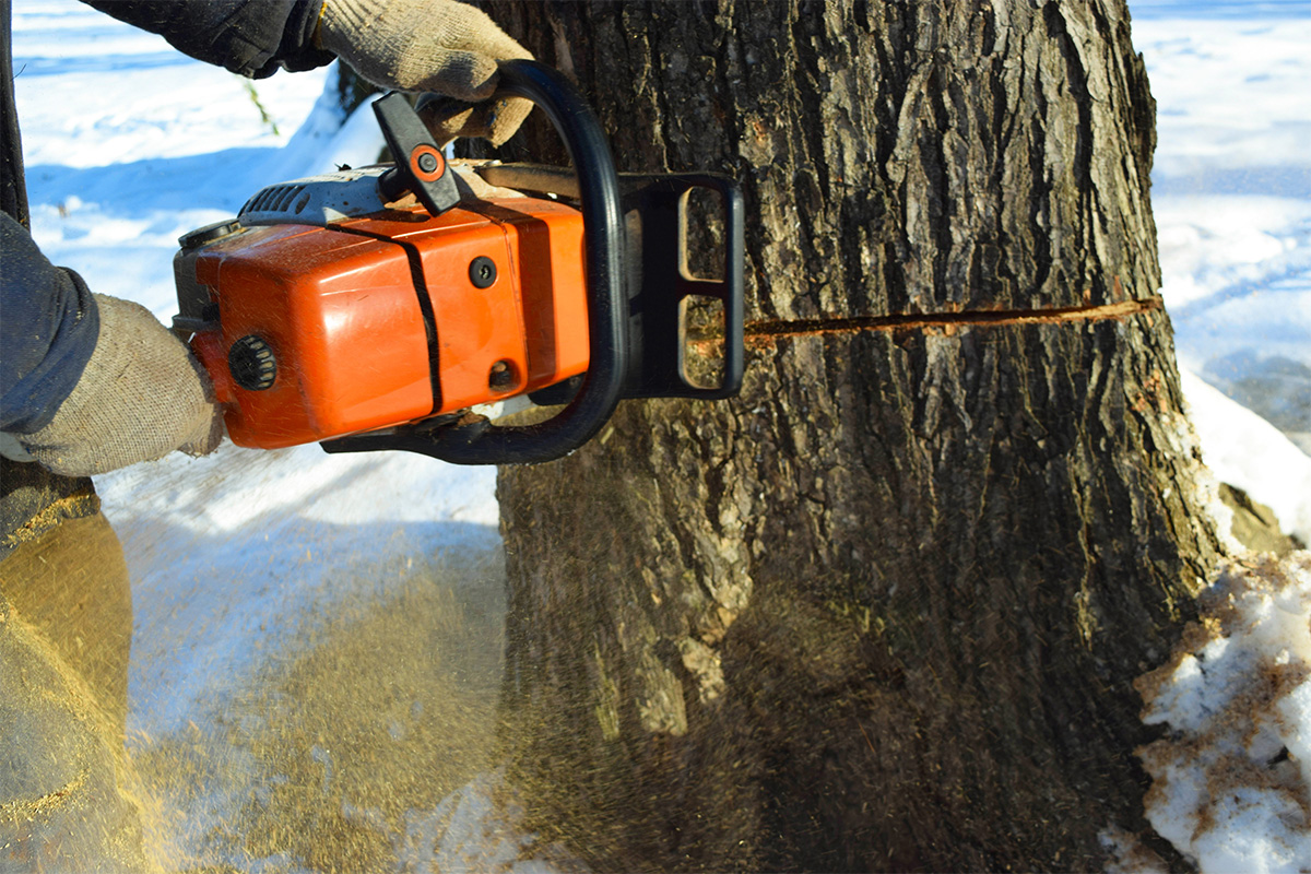 Podiramo in razrežemo manjša drevesa okoli hiš, po potrebi drevo privežemo na ročni vitel, da določimo varno smer podiranja drevesa.